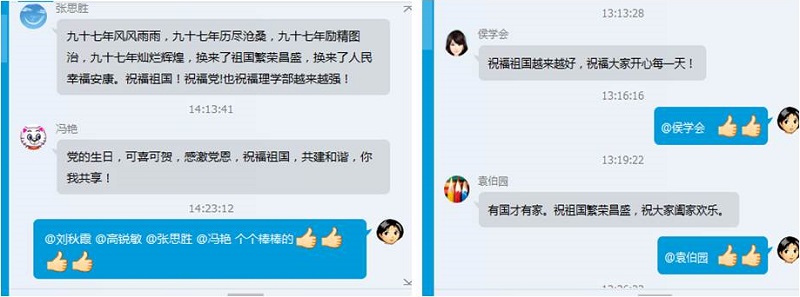 “同祝福共庆生日”活动在部门微信群、qq群中进行地如火如荼,激发了大家的爱国热情和创作热情,一个个将祝愿写成诗句: