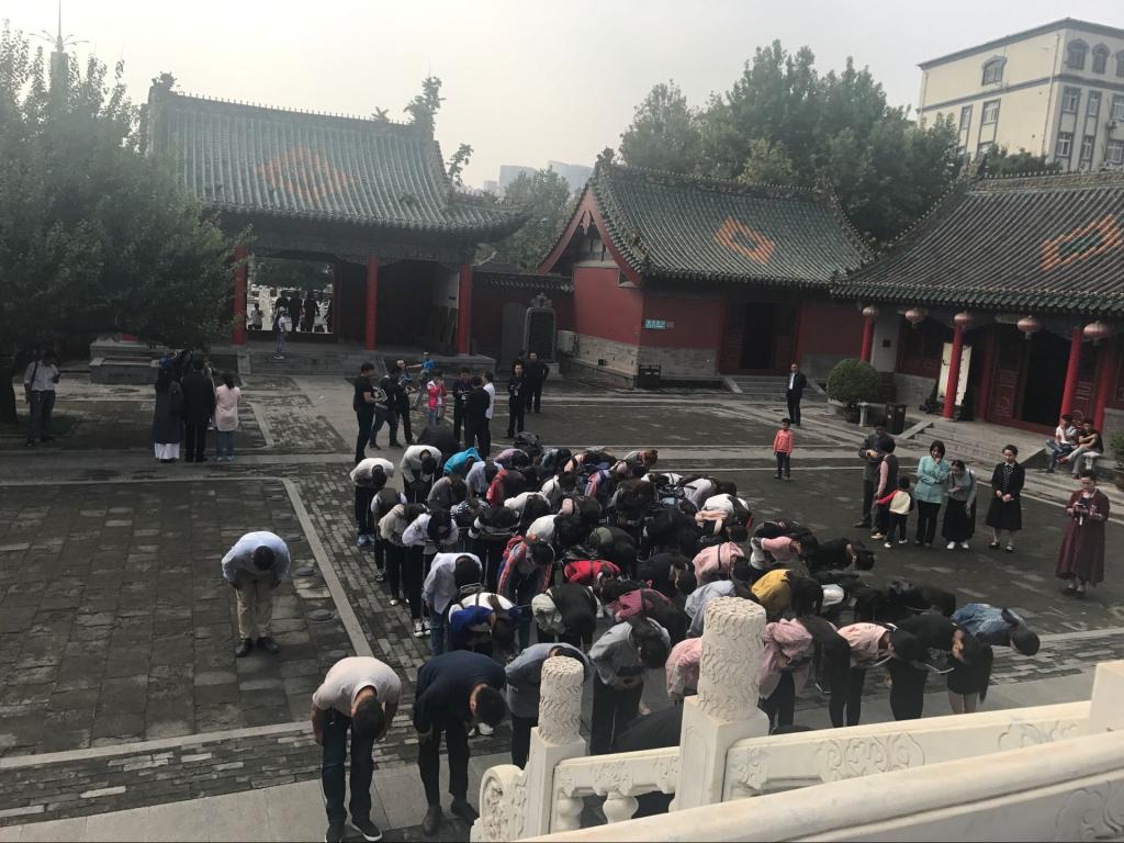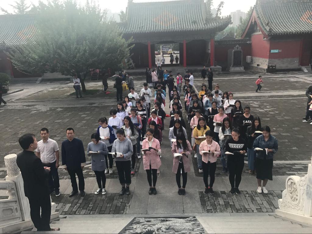 为传承和弘扬中华优秀传统文化,让学生走近孔子,感受儒家思想的博大精深,加强政治思想教育,提升综合文化素质,营造具有浓厚传统文化特色的校园文化氛围,应河南省儒学文化研究会的邀请,在基础课教研部领导的大力支持下,在“易成书院”杨昀老师的多方协调促成下,我部组织我校文法学院、金融学院学生于2017年9月18日参加“丁酉年纪念孔子诞辰2568周年郑州文庙祭孔典礼”。