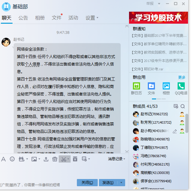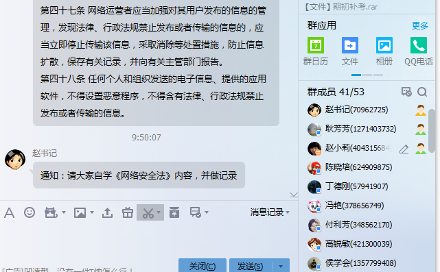 为了迎接校庆、十九大顺利召开,基础部加强网络安全教育,充分利用部门微信、qq群学习《网络安全法》,提醒教工树立高度的网络安全意识,不信谣传谣,为自己宣传、发布的内容负责。