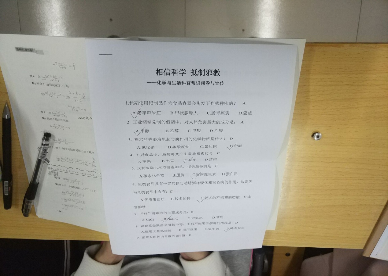 自10月份以来,ok138cn太阳集团529党员干部和教工们群策群力,根据部门数理化学科特色,收集了大量“物理与生活”、“化学与生活”等科普知识,并编排整理和打印。上周开始,他们利用课堂、课下在三校区大力开展问卷调查和宣传活动。志愿者们有的在课堂上进行宣传教育,有的利用课外时间开展问卷调研。宣传调研题目有:急性扭伤后应立即冷敷还是热敷?长期使用铝制品作为食品容器会引发下列哪种疾病?反复淘洗大米或浸泡加热,损失最多的是下列哪种物质……题目内容丰富,深受学生欢迎。老师们还根据物理、化学原理,从科学角度给出了解答。