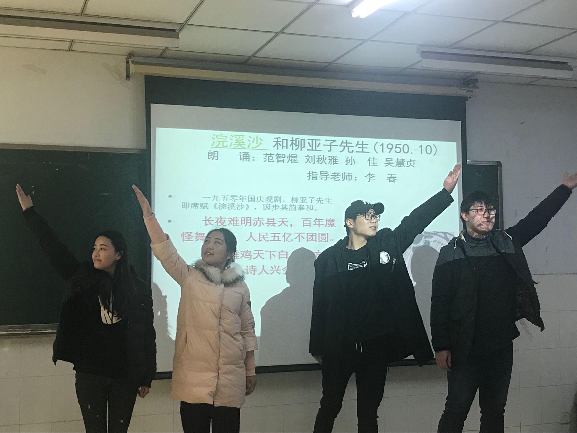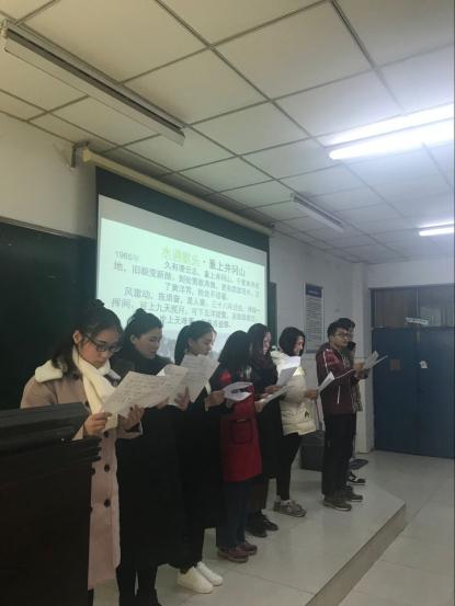 活动第二阶段为“毛泽东诗词鉴赏诵读活动”。由于报名人数多,分散在20多个系院三个校区,经研究,诵读活动按三个校区分别举行“百人诵读”活动。首场诵读于12月20中午1:00在北林校区进行,诵读现场热烈、火爆,有单人诵读、双人诵读、小组诵读等形式多样,掌声不断;第二场英才校区诵读专场,12月21日下午在W107进行,150人左右的教室热闹非凡,图书馆魏秀娟馆长对毛泽东诗词的经典讲解和激情朗诵,使诵读活动呈现了更高水平,基础部全体教师的集体诵读又一次将现场气氛推向了高潮。第三场诵读在龙子湖进行,尽管时值13:00,正是人困休息时间,但诵读现场同学们个个精神饱满,难掩兴奋之情。来自生物工程等多个院系、专业的学生的积极登台,有《沁园春·长沙》、《忆秦娥·娄山关》、《浪淘沙·北戴河》、《卜算子·咏梅》、《水调歌头·重上井冈山》、《贺新郎·读史》等多首脍炙人口的作品展现给大家,同学们自排自演,声情并茂,场面引人入胜。