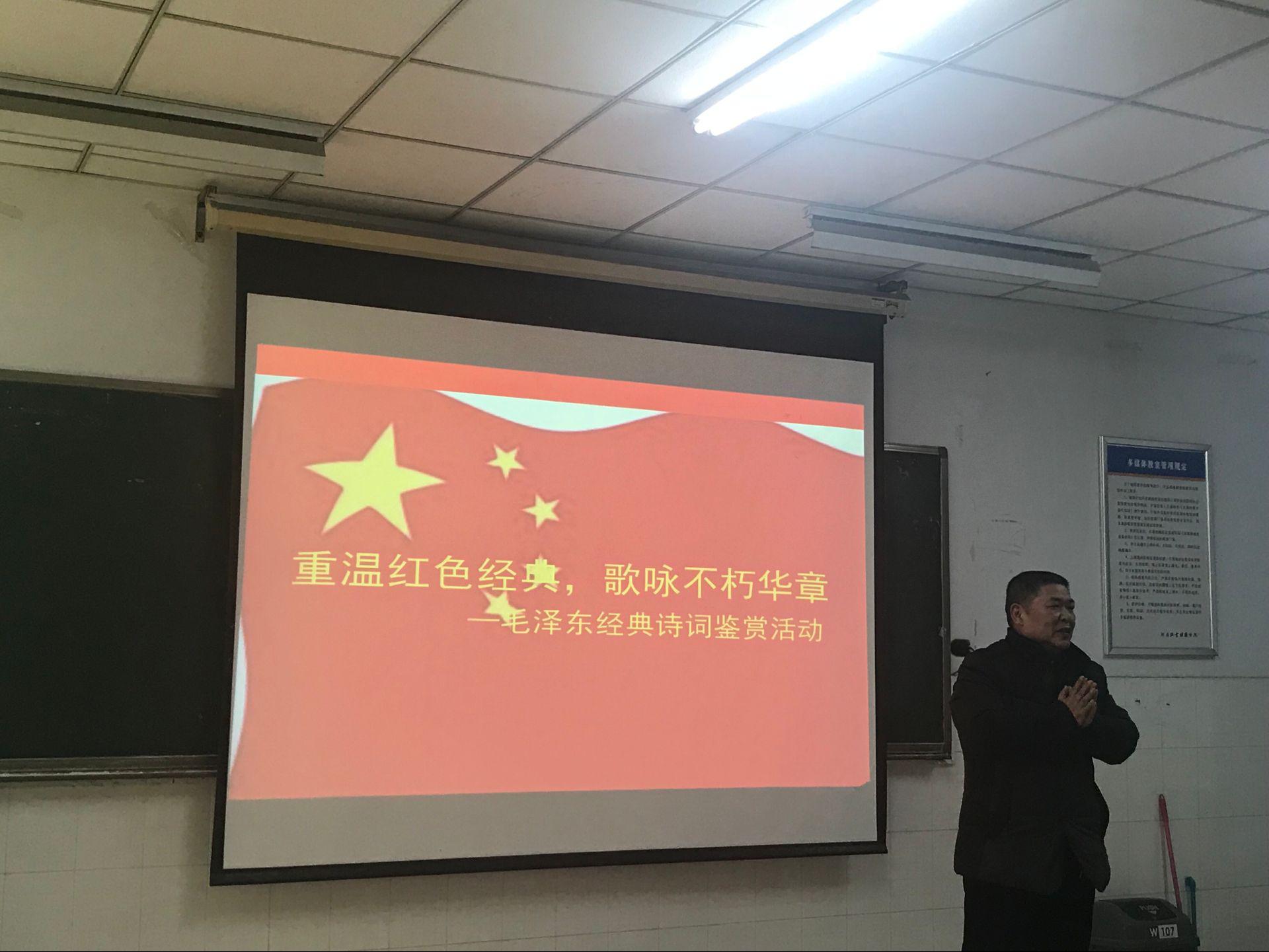 我校由宣传部、基础部、图书馆、文法系、物流电商学院联合主办,基础部和图书馆承办的“重温红色经典,歌咏不朽华章——毛泽东经典诗词鉴赏系列活动”,自12月9日开始以来,即在广大师生中引起了广泛关注与共鸣,截止到12月25日圆满结束,反响强烈、收效斐然。