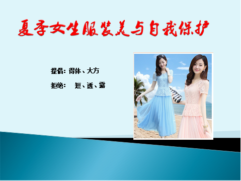 1. 全体教师课堂第一张ppt打出“夏季女生服装美与自我保护, 提倡得体、大方,拒绝短、透、露”。
