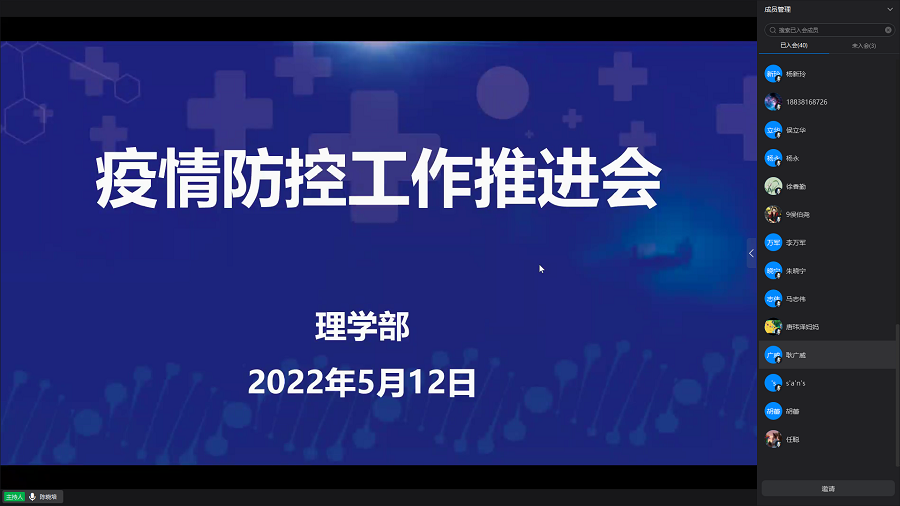 5月12日下午,ok138cn太阳集团529通过钉钉视频会议形式,组织召开疫情防控工作推进会,对部门新冠疫情防控工作进行再要求、再强调、再落实,全体教工参会。会议由党总支书记胡蕾主持。