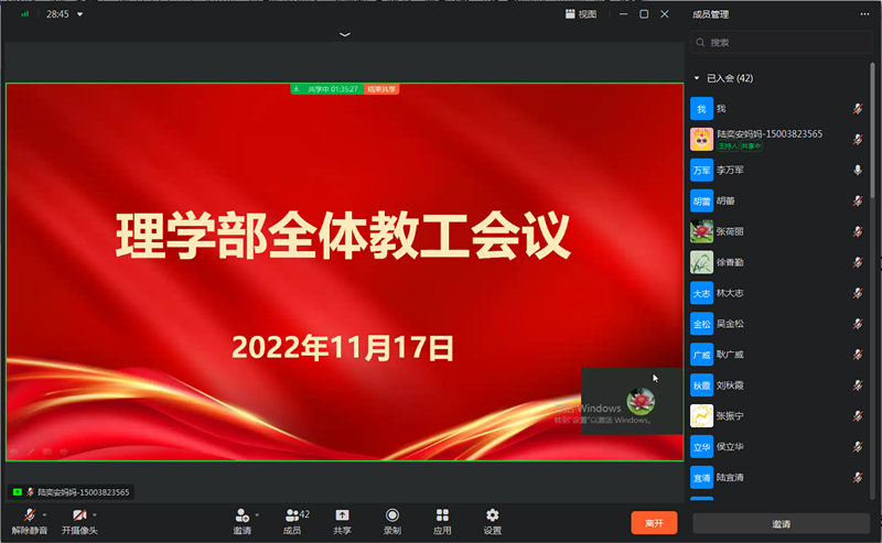 会上,部门疫情防控各网格长介绍了近期主要工作。胡蕾重点领学《党委书记穆瑞杰在学校疫情防控工作视频调度会上的讲话》,介绍了中共中央政治局常委会研究部署新冠疫情防控工作的二十条措施内容、社会面及学校疫情防控的整体形势、入校教师志愿服务和本部门疫情防控要求等工作情况。李万军主任对近期教师职称评定、固定资产清查和实验室消防安全保障等工作进行了安排部署。副主任林大志介绍了本轮疫情发生以来开展线上教学和期末考试的情况,就期末考试组织对全体教师进行了线上培训。副主任张荷丽结合疫情防控工作对党的二十大报告中《新时代新征程中国共产党的使命任务》进行了深入解读。