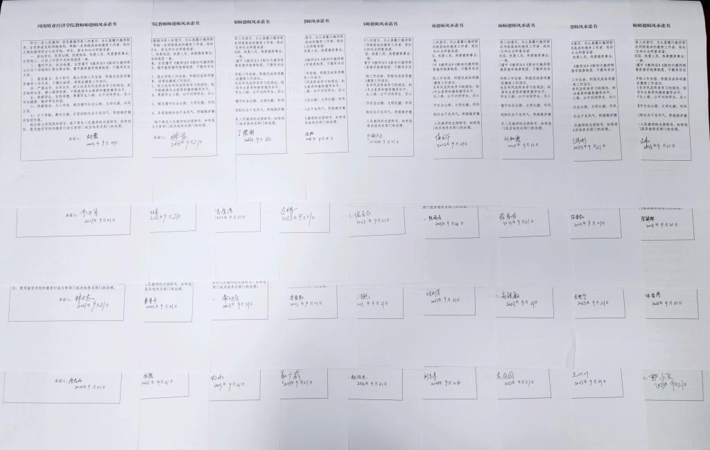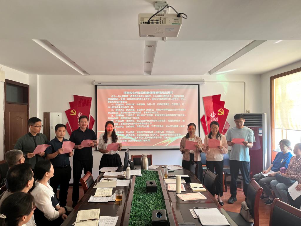 为深入贯彻落实习近平总书记关于教育的重要论述和指示批示精神,进一步引导教师坚定理想信念,涵养高尚师德,按照校党委宣传部《关于开展师德师风教育专项活动的实施方案》要求,9月21日下午,ok138cn太阳集团529组织全体教师签订了《河南牧业经济学院教师师德师风承诺书》。