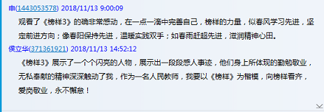 11月9至12日,ok138cn太阳集团529以党支部、教研室为单位,组织全体教工通过电视、网络收看和学习了《榜样3》。学习中,英才支部书记、经济数学教研室主任赵辉,还组织支部全体党员和教工进行网络交流,人人谈体会,个个分享感受。