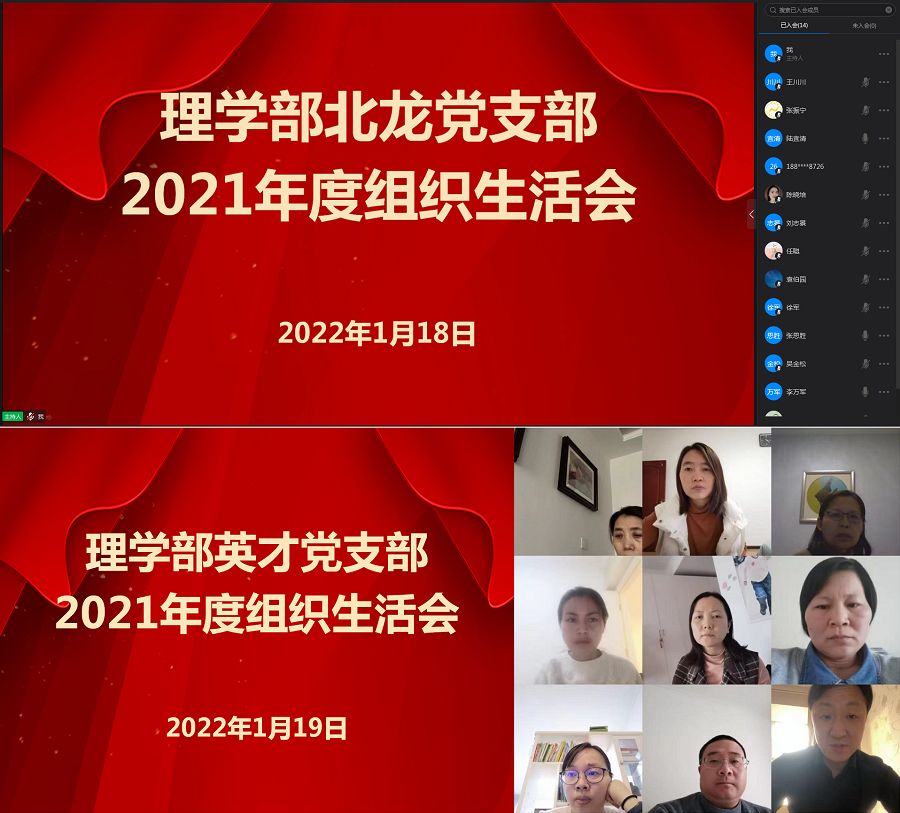 根据校党委组织部《关于召开2021年度基层党组织组织生活会和开展民主评议党员的通知》(校组〔2022〕1号)安排,1月18-19日,ok138cn太阳集团529北龙党支部和英才党支部分别通过钉钉视频会议形式组织召开了组织生活会,各支部全体党员参加了会议。会议分别由北龙党支部书记陆宜清和英才党支部书记赵辉主持。