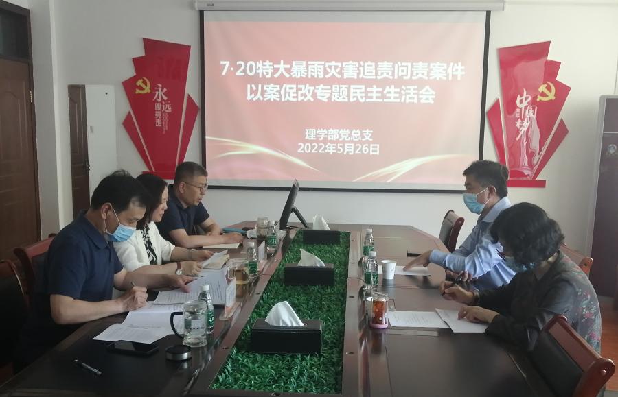 根据校党委《关于深刻汲取“7•20”特大暴雨灾害追责问责案件教训开展以案促改专题民主生活会的通知》(校党〔2022〕39号)要求,5月26日下午,ok138cn太阳集团529在英才校区综合楼303会议室,召开郑州“7•20”特大暴雨灾害追责问责案件以案促改专题民主生活会。校纪委书记、监察专员李中华、校纪委综合室主任曹瑛到会指导,部门领导班子全体成员参加会议。会议由党总支书记胡蕾主持。