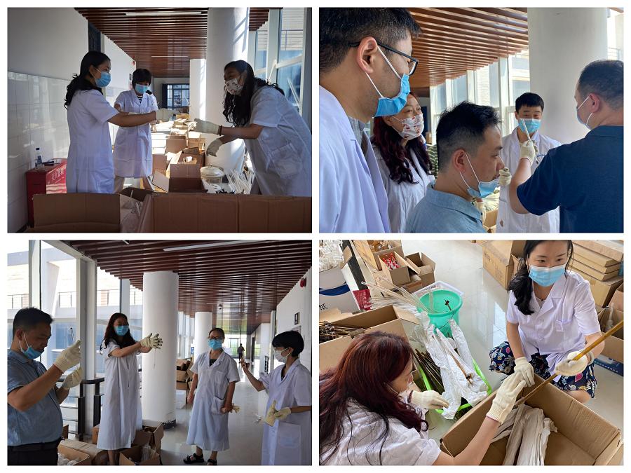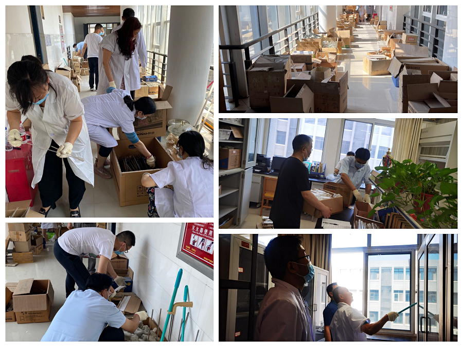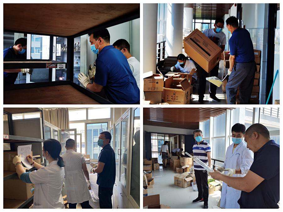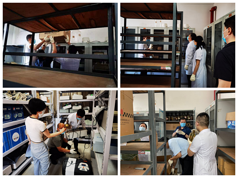 22名党员同志和化学教研室、物理教研室全体教师一起,每三人一组,共分成10个清理小组,对库房里的化学实验仪器和耗材进行了一次彻底清理和盘点。大家先将柜子里的仪器器皿和架子上的纸箱全部搬出,然后一一清点、分类整理、分别摆放,最后再区分使用频次高低,依次入柜上架。老师们或站或蹲、或递或接,分工有序、相互配合,有的仔细清点数目,有的小心翼翼摆放,为便于查找使用,还在纸箱的外包装上细致地标注上品名、规格等。
