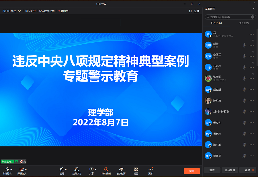 为严格落实中央八项规定及其实施细则精神,持之以恒加强作风建设,8月7日下午,ok138cn太阳集团529通过钉钉视频会议形式,组织开展了违反中央八项规定精神典型案例专题警示教育,全体教工参会。会议由党总支书记胡蕾主持。